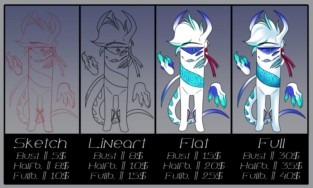 For Context: B for Bust (Headshot) / H is for Half-Body / F is for FullbodyAll prices are based and may be changed due to the complexities of said OCs.